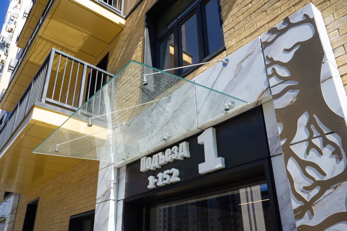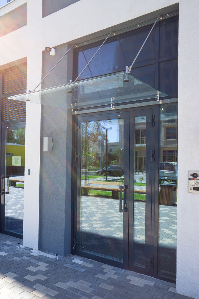 Кроме обычных свойств, такое изделие обладает неповторимым интерьерным шармом. Появление такого навеса подчеркивает солидность здания, не загораживая основной фасад зданий. Если того требует дизайнерское решение, можно легко придать стеклу требуемый оттенок.